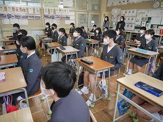 本日、朝の全校集会をしました。生徒指導担当が、相手の気持ちを考えて行動し、「いじめ」「暴力」「暴言」などは絶対せず、「笑顔いっぱいの学校」をみんなで創りましょうと話しました。