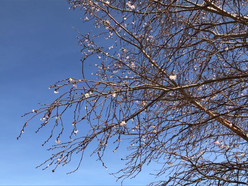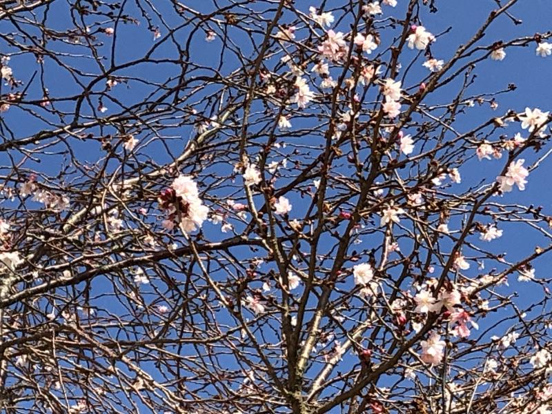 いつの間にか運動場の桜の木に花が咲き始めていました。遠くから見ると薄らとピンクがかったようで、つぼみが膨らみ始めたのかと思い近づいてみると、なんと可愛らしい花がたくさん咲いているではありませんか!!
