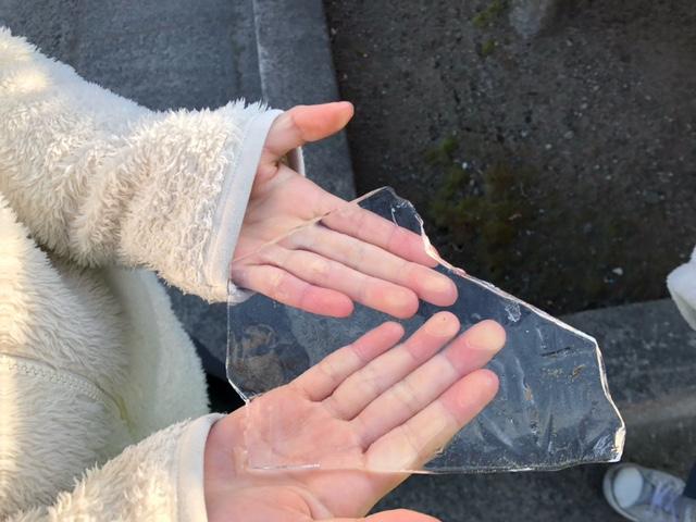 放射冷却で寒い朝となりました。登校中に水たまりに張った氷を見つけて持ってきてくれた児童がいました。
