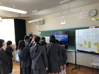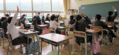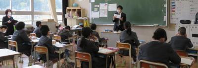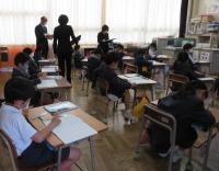 6年生は4月から入学する輪島中学校へ行き、英語の体験授業を受けました。中学2年生の英語での学校紹介のVTRを視聴した後、入学してから頑張りたいことを英語で伝える学習をしました。自分が入りたい部活や勉強したい教科、楽しみな行事などを英語で話したり、書いたりしました。中学校の先生の指示がほとんど英語でしたが、6年生はしっかり聞き取り、緊張しながらも楽しんでいるようでした。