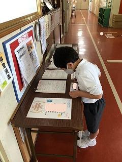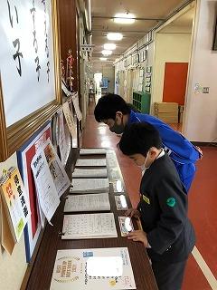 高学年に混じって低学年もなかなか頑張っていました。これからが楽しみです。職員室前の廊下に展示しました。さっそく友達のノートをじっくりと見ている児童がいました。