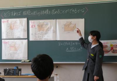 5年生算数の授業では、ボードにグループでの考えを書いていました。グループで話し合い、練り上げたことを、根拠や理由を明確にして相手に伝え、更に深めていけるように、学校で授業を行っていきます。