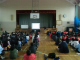 全校集会は、まだ体育館の改修が終わっていないためにランチルームで行われました。校長先生からは72年前の広島原爆投下により多くの犠牲者が出たことや現在もその後遺症と闘っている人がいること、戦争という争い事を例に挙げ、子どもたちに「ケンカではなくお互いの気持ちを納得いくまで話し合うことが大切であること」について話がありました。