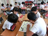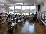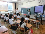 5年生は、英語の絵本の読み聞かせです。ALTのジュリア先生も加わり、動物の鳴き声を知ることができました。ページをめくるたびに子どもたちのうれしそうな顔が印象的でした。