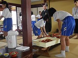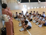 今年も保護者対象の着付け教室が行われました。地域の先生に着付け方を習いながら保護者の皆さんも一緒に練習しました。