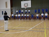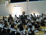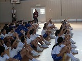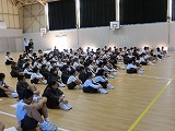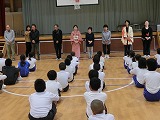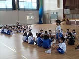 犯人が捕まった後、全校児童が体育館に集合し、輪島警察署の方から不審者から逃げる方法などのお話をしてもらいました。4名の1年生が前に出て練習しました。