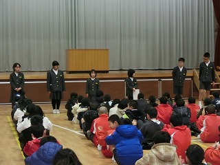 恒例の引き継ぎ式が行われました。5・6年生が引き継ぐ4年生にまだらの披露をしました。6年生代表の西さんが「しっかり練習して、伝統を引き継いでください。」とあいさつをしました。