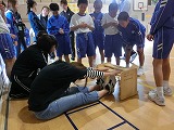 火災対応の避難訓練を行いました。避難後の体育館で消防署員さんから「火事では火よりも煙を吸ったことで死亡する確率が高くなる」「火遊びを絶対しないこと」など命を守るためのお話がありました。