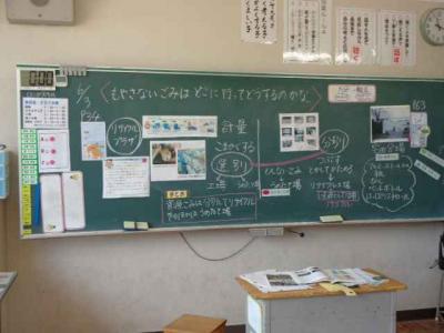 端末のプレゼンテーションの作成・付箋機能の活用をして、社会科の授業でゴミについて学習していました。