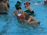 始めは小プールでお魚(模型)拾い。次に、大プールへ。初めて入る1年生は怖そうにしていましたが、6年が優しくオンブや抱っこを。
