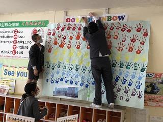 6年生最後のプロジェクト。「みんなの心を一つに」という思いをこの手形で表現しました。児童・職員123人分の手形が掲示されました。6年生の元気な手や1年生のかわいい小さな手など.手にも表情があるようです。