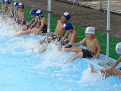今日は午前中雲が多く、熱くなりすぎない間に水泳記録会を行うことができました。1・2年生は水中ジャンケンや輪くぐり、お宝ひろいや5mけのびなどの種目に挑戦しました。