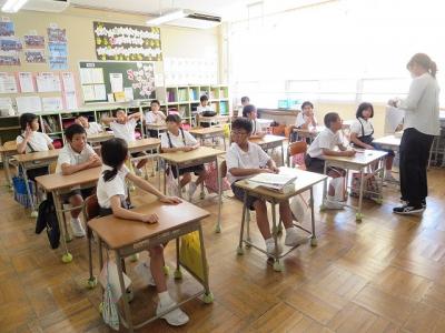 『平和の鐘』を歌う明るい声が学校中に響いていました。今日は図書の本の借りかえをしたり、2学期のお楽しみ会の相談をしたりしたそうです。完成した宿題や作品も集まってきていました。2学期もみんなそろって元気にむかえたいものです。
