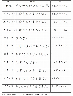 低学年の水泳記録会では、低学年用の昇級表(ラッココース)から自分の目標を決めて、一生懸命に取り組んでいました。また、水泳の得意な子もいて高学年用の昇級表(イルカコース)から目標を決めていました。