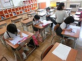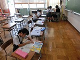 夏休みに入り、補充学習を行っています。これまでの復習や夏休みの課題帳を先生に習いながら進めています。暑くてもこの後の水泳教室のプールに入れることもあり、よくがんばっていました。水泳教室までの間、自主的に学習に登校する児童もいます。
