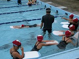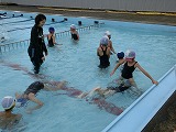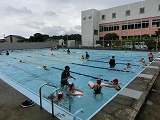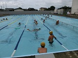 昨日の大雨で中止になった水泳教室は、今日が初日となりました。1年から6年までの希望者と8月の市内水泳記録会に参加する児童が対象です。今日は約50名が練習しました。各コースに先生たちが指導につき、子どもたちもうれしそうに練習していました。