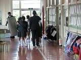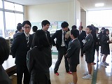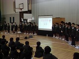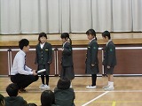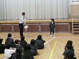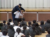 犯人が捕まった後、全校児童が体育館に集合し、輪島警察署の方から不審者から逃げる方法などのお話をしてもらいました。4名の1年生が前に出て練習しました。