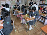 生徒玄関前には、家庭学習時間や各種検定試験の結果などが掲示されていました。先輩たちの活躍や頑張りに、自分たちも中学生になるための学習準備や心得などをしっかりと準備しておく必要感をもったようでした。