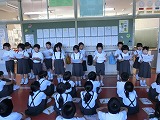 3年生の学年発表 4月から習い始めたリコーダーで「笛星人」を演奏。タンギングや動作をつけながらとても上手に演奏できました。