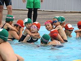 始めは小プールでお魚(模型)拾い。次に、大プールへ。初めて入る1年生は怖そうにしていましたが、6年が優しくオンブや抱っこを。