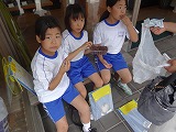 始めは小プールでお魚(模型)拾い。次に、大プールへ。初めて入る1年生は怖そうにしていましたが、6年が優しくオンブや抱っこを。