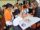 英語の歌でお迎えした後、これまで学習してきた英語を使って自己紹介をしました。そして、外国では珍しい折り紙を児童がていねいに教えると、留学生も嬉しそうに作品を作っていました。短い時間でしたが、児童も留学生も名残惜しそうにお別れしました。国際交流という貴重な経験ができました。