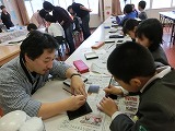 輪島市漆器青年会のみなさんの指導を受け、沈金体験をしました。ノミの使い方が思った以上に難しく、慎重に作品を仕上げていました。