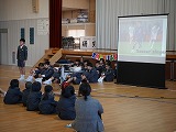 この後、体育館に集まり、署員の方から「いかのおすし」など不審者に出遭った場合の対応について教えてもらいました。