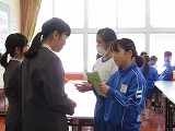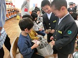 1年生の手作りのプレゼントにニッコリの6年生。ちょっと照れ気味。