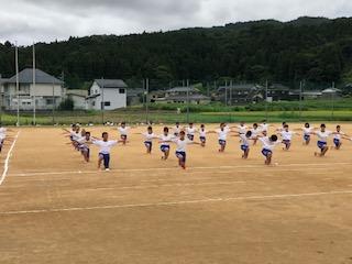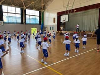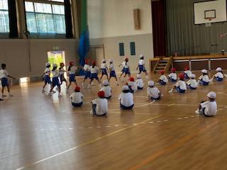 運動会練習の真っ只中です。1~3年生のダンス練習では、低学年リーダーの3年生が下級生に踊りのお手本を見せていました。