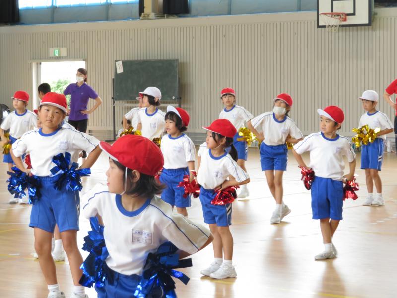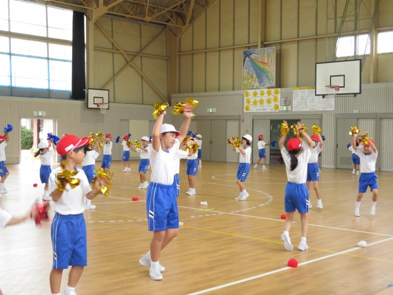 ポンポンを持ちながら楽しそうに練習する低学年児童