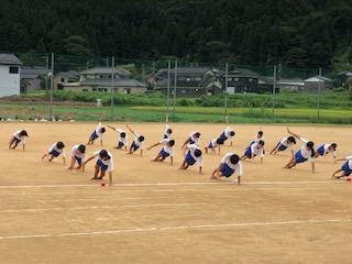 今日から運動場。指先まで伸ばすこと、縦横の列をそろえることを意識した高学年練習