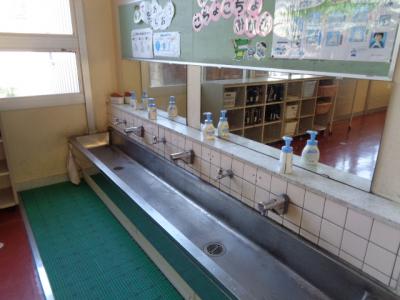 手洗い場が自動化されました。コロナウイルス感染症の拡がりが危惧される中での感染予防策です。密を避けるために1つおきになっていますので、手洗いの徹底とソーシャルディスタンスの確保をしっかり指導していきます。
