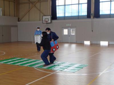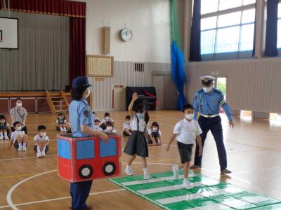 輪島警察署の4人の皆さんが、1.2年生に横断歩道の渡り方についてお話と実施訓練をしてくれました。ミニ劇を使った分かり易いお話でした。また、パトカーの乗車体験もありました。