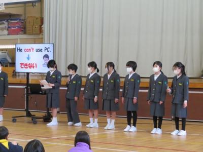 書き初め大会の表彰と英語を使った5年生の学年発表がありました。