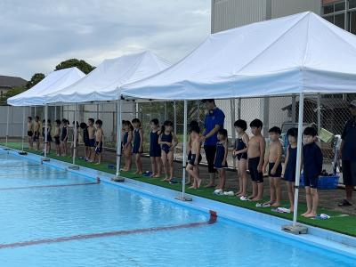 今日は午前中雲が多く、熱くなりすぎない間に水泳記録会を行うことができました。1・2年生は水中ジャンケンや輪くぐり、お宝ひろいや5mけのびなどの種目に挑戦しました。
