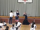 今月の生活目標は「あとしまつをきちんとしよう」です。間庭先生は模擬刀を使い、使った後の手入れと「次の準備のために後片づけをすること」の大切さを話してくれました。