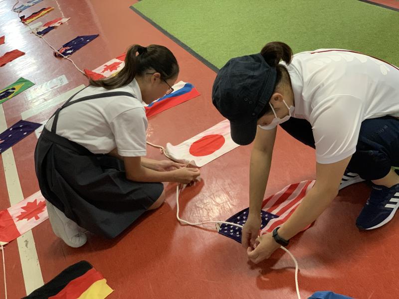 万国旗の点検 円陣を組み、高学年の団結を