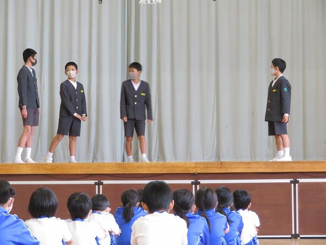 のパターンについて、やってはいけない行動や言葉かけを演じた後に、望ましい行動を比べて演じているので、1年生も大変わかりやすい内容でした。感染者数が毎日のように報道される中で、すごく温かい気持ちになる6年生の劇でした。