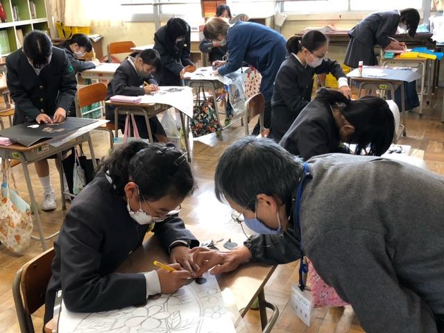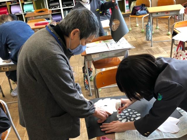 2学期最後のクラブ活動がありました。切り絵クラブは共同作品づくりのためにまずは個人作品に取り組んでいました。今日はお二人の地域の先生に来ていただきました。細かい作業のしかたを教えてもらい、少しずつ作品らしくなってきました。