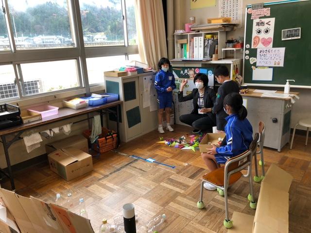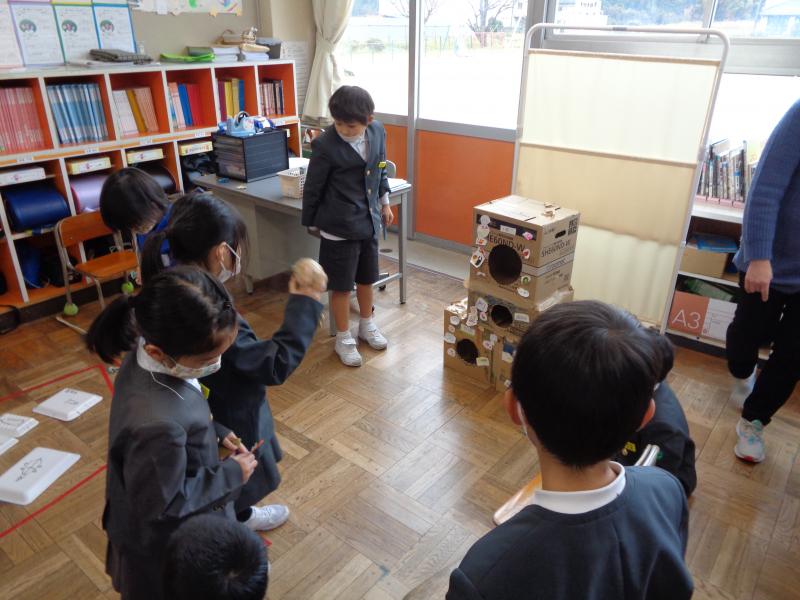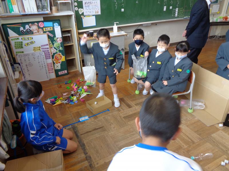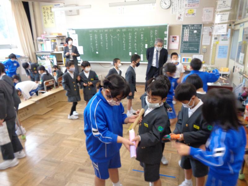 2年生は生活科「あつまれ あそびのひろばに」の学習で、1年生を招待して遊んでもらいました。(※マスクの着用、換気に気をつけて実施しました。)各ゲームコーナーには手作りの遊び道具があり、1年生に遊び方を優しく教えてあげたり、得点をサービスしてあげたりする姿も見られました。
