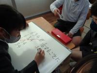 1年生が、算数で数字の1~5を練習していました。10人とも丁寧で上手な数字でした。3について苦労しているようでしたので、ご家庭でも、練習に取り組んではいかがでしょうか。