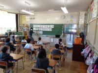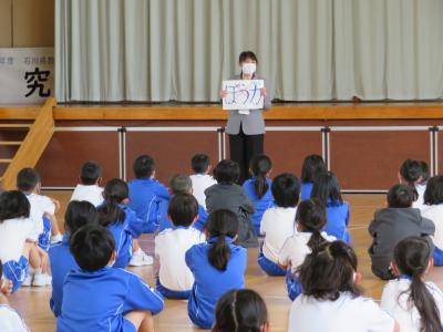 13:55~14:05のスキルアップタイムで2年生が外国語を学んでいました。H30 R1と石川県指定の英語教育強化拠点事業校として積み上げた指導法をいかして、3.4年生から始まる外国語活動に繋げています。