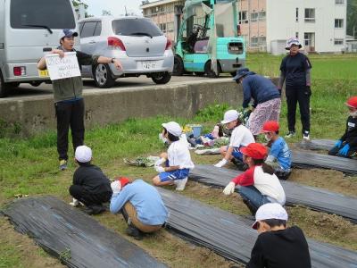 校務士さんがマルチをはって準備をしてくださいました。草をむしってから説明をよく聞きます。