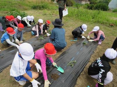 6月1日(木)、1・2年生合同でさつまいもの苗を植えました。