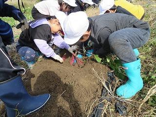ツルを切り、シャベルでイモを傷つけないように気をつけながら探します。見つけたら手で土をかき分けていきます。