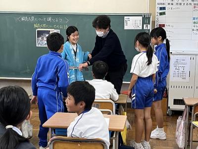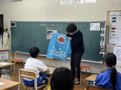 4年生の社会科で県内の文化財や年中行事について調べ学んでいます。地域のゲストティーチャーとして、大野聖一さんにお話をしていただきました。