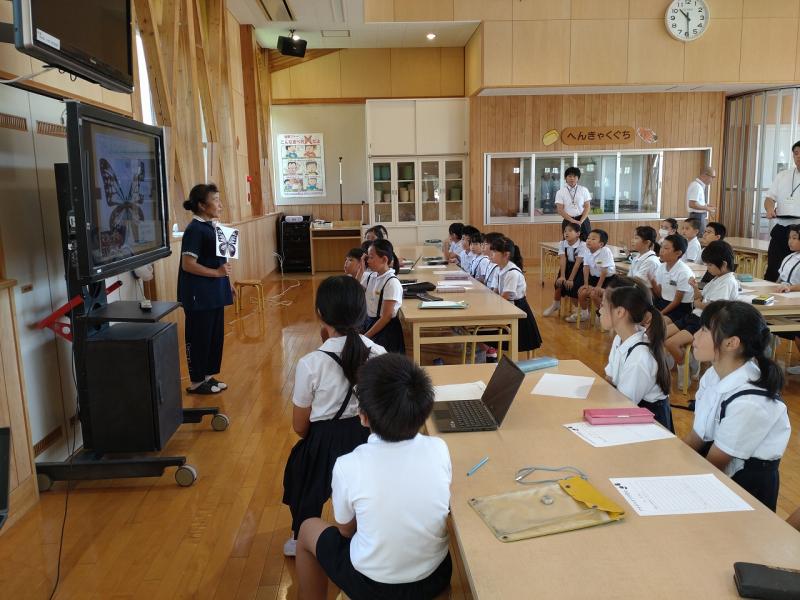 9月12日、押水地区の3校の3年生が、総合的な学習のテーマとして取り上げているアサギマダラについて、合同の学習会を行いました。講師はアサギマダラに詳しい地元の堀千惠子さんです。