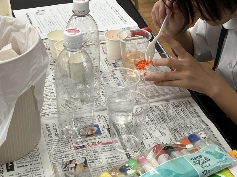 9月21日に行われた科学実験教室では、今回は「ゲル化の科学」ということで、人工イクラ作りをしました。粉末を入れたり、液体同士を混ぜたりしながら粒状に固まっていく液体に児童は驚いている様子でした。実際に食用で製造されている人口イクラとほぼ同じ製法ということでした。また後半は、好きな色を使った人工イクラを制作してペットボトルの中に入れ、オブジェを作りました。友達と色を交換しながら、個性あふれるものを作っていました。