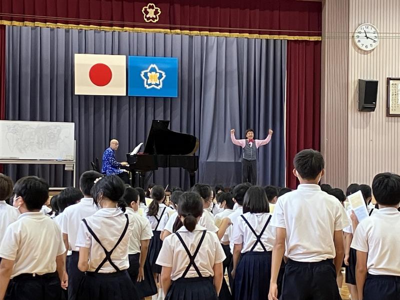 次年度、小学校が統合され、新たに押水小学校が誕生します。先頃、その校歌が発表されました。それを受けて、今、校歌を練習しています。この日(9月20日)は4年生と5年生が合同で練習をしました。